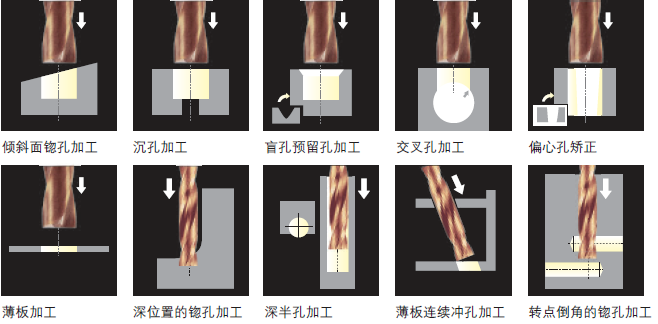□ 一把刀具可實現(xiàn)多種用途,在斜面鉆孔、圓弧面鉆孔、薄板鉆孔和抑制出口毛刺等方面都有很好的表現(xiàn)。