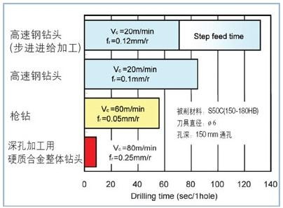 圖3所示的是最新深孔加工用硬質合金整體鉆頭與以往的深孔加工用鉆頭切削時間的對比情況。采用直徑為直徑6mm的內冷型鉆頭,加工孔深為150mm的深孔,分別采用各自推薦的常規切削條件進行加工。結果顯示,整體硬質合金鉆頭的加工時間大約是以往加工方式的1/5(與槍鉆相比)~1/10(與高速鋼鉆頭相比)大幅提高了生產效率。