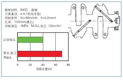 圖4所示的汽車零部件的曲軸上有一斜且深的潤滑用油孔,以往采用高速鋼鉆頭或槍鉆加工。為了提高加工效率,建立經濟、靈活的柔性生產,可采用加工中心組成生產線,并使用硬質合金整體鉆頭。在考慮到保護環境問題的同時,此零件的加工采用半干式加工替代了濕式加工。半干式加工時工具的壽命可達72m/reg,相對于傳統工具而言提高了1.8倍。即使是與濕式加工相比較,也可以得到同等以上的壽命。