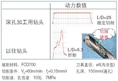 當加工球墨鑄鐵時,如圖2所示,使用普通鉆頭切削,當L/D=5.3時就會因切屑堵塞鉆頭發生折斷現象而無法繼續加工下去。而采用最新的深孔加工用硬質合金整體鉆頭,L/D=25的深孔也可用非步進進給方式實現穩定加工,且未見切削動力消耗的上升。